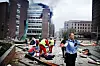 Det er som en grusom scene tatt ut av en film. Regjeringskvartalet er som en krigssone. Alle vinduene i høyblokka er blåst vekk, og Lien kan se tvers gjennom bygningen. Han ser flere alvorlig skadde. En kvinne løper ut av bygningen med sjokk i blikket og en pinne stikkende ut av hodet. En mann har fått splintskade i låret og får desperat hjelp for å stoppe blødningen. En annen ligger livløs på bakken og blir dekket til.