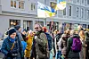Det blå og gule flagget svever i morgensolen, og tårer renner blant demonstrantene mens de synger den ukrainske nasjonalsangen og roper slagordet «Stopp Putin! Stopp krigen!»