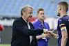 Rosenborg-trener Åge Hareide takker Gustav Valsvik, med regnbueflagget på armen, for kamp.