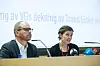 Sjefredaktør Gard Steiro og nyhetsredaktør Tora Bakke Håndlykken under presentasjonen av VGs egen evaluering av avisas dekning av dansevideoen med Trond Giske. Foto: Berit Roald / NTB scanpix