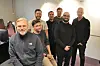Gründerne Frode Lia (t.v), Jonas Feiring, Petter Veland og Jonas Giæver sammen med Shubam Mehra og Henrik Glasø Skifjeld i FC Quiz. Helge Birkelund, direktør for sportsutvikling i Amedia og styremedlem i FC Quiz helt til høyre.