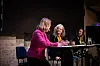 Utenriksminister Anikken Huitfeldt (t.v.) i panelsamtale med Gro Holm og Pamela Moriniere på NJs markering av kvinnedagen.Foto: Anna Stjern