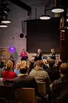 NRKs Gro Holm, som nylig kom tilbake fra reporteroppdrag i Ukraina, ledet arrangementet. På programmet sto filmfremvisning, personlige historier og panelsamtaler.