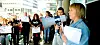 SAMRØRE: APF-organiserte journalister i Dagsavisen konfronterer daværende sjefredaktør og APF-kollega Hilde Haugsgjerd under streiken i 2002. Foto: Kathrine Geard