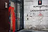 Noen få minutter senere står han fremfor døren til domstolen. Inngangspartiet har blitt feid over med rød maling, og på veggen er det tagget «Døm overgriperne» flere steder.