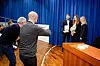 Helseminister Bent Høie mottok utvalgets utredning fra utvalgsleder Benedikte Moltumyr Høgberg i Helse- og omsorgsdepartementets lokaler i Akersgata. Her blir de fotografert av noen av de som var tilstede. Foto: Eskil Wie Furunes