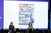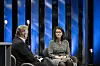 Pippa Crerar har fulgt Boris Johnson lenge. Bildet i bakgrunnen er fra tiden han var borgermester i London og Crerar var journalist i London-avisen Evening Standard. På scenen ble Crerar intervjuet av VGs Yngve Kvistad.Foto: Thor Brødreskift / Nordiske Mediedager