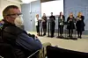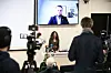 FINLAND: En finsk fotograf velger å bruke munnbind under en pressekonferanse i Helsingfors hvor myndighetene presenterer sine koronatiltak.Foto: Reuters / NTB scanpix