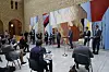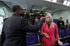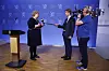 BELGIA: De to fotografene har ingen problemer med å holde god avstand på denne pressekonferansen i Brussel.Foto: Olivier Matthys / AP / NTB scanpix