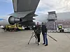 Philip Lote (t.h) og fotograf Jorne Van Damme er på flyplassen i Liege i Belgia i mars for å lage sak om ankomsten av smittevernsutstyr fra Kina.Foto: VRT