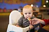 Isak (9 måneder) smaker på aioli for første gang mens han er med mamma Henriette Ydse Krogstad på intervju.Foto: Kristine Lindebø