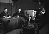 Erik Tandberg, Oddvar Bernsten og Per Øyvind Heradstveit i Dagsrevyen-studio i 1959. Bla nederst i saken for å se Dagsrevyen-studio gjennom tidende. Foto: NRK Arkiv