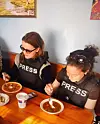 – Vi var i Mykolajiv i oktober og våknet av eksplosjoner midt på natten. Gikk ned i et over gjennomsnittlig sprekt bomberom. Vi var de eneste gjestene på hotellet. Til venstre står fikseren min Tanja, og de vi sitter med er to som jobber på hotellet, sier Grieg Riisnæs om bildet.Foto: Gina Grieg Riisnæs