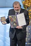 Dmitrij Muratov viser fram gullmedaljen og diplomet under utdelingen av Nobels fredspris i fjorFoto: Heiko Junge / NTB
