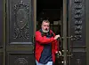 Sjefredaktør Dmitrij Muratov på vei ut av bygningen til russisk høyesterett i dag.