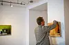 Tommy Ellingsen retter på bildene til Erlend Berge, som er første fotograf til å stille ut i galleriet Ellingsen & Worsøe. Foto: Kristine Lindebø