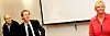 F.v. nestleder Lars Døvle Larsen i konsernlaget NJE, Mecom-sjef David Montgomery og Carine Johansen, leder for konsernlaget NJE. Foto: Birgit Dannenberg