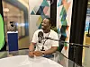 Som journalist i Fædrelandsvennnen har Joel Nziza fått muligheten til å prøve seg på ulike arbeidsoppgaver. Her er han i podkaststudio.Foto: Victoria Nevland