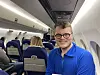 Journalist Ole Gunnar Onsøien rakk ikke den planlagte direktesendinga fra Honningsvåg mandag kveld. Likevel smiler han.Foto: Hjelpsom medpassasjer på Widerøes flight WF978