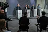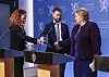 Pressekonferanse 12. mars: Helseminister Bent Høie avverger at direktør for Folkehelseinstituttet Camilla Stoltenberg (t.v) og statsminister Erna Solberg håndhilser.Foto: Lise Åserud / NTB scanpix