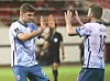 Alexander Sørloth og Fredrik Midtsjø feirer etter Norges 1-0-scoring.