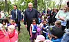 Kong Harald får mange spørsmål av barnehagebarn under åpningen av Prinsesse Ingrid Alexandras Skulpturpark.Foto: Lise Åserud / NTB