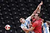 Norges Sander Sagosen (til høyre) lar seg ikke be to ganger når Argentinas forsvarsspiller Pedro Martinez Cami nærmest byr opp til tangodans. Foto: Stian Lysberg Solum / NTBFoto: Stian Lysberg Solum / NTB
