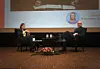 På scenen blir han intervjuet av NRK-journalist Eline Buvarp Aardal.