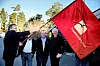 18 frilansere fra Danmark, sammen med folk fra Paris, Stockholm og Amsterdam har tatt turen til Oslo. Jens Rossen, som holder fanen, sitter i Hovedstyret i Dansk Journalistforbund. Foto: Roger Brendhagen