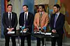 Budsjettpartnerne Henrik Asheim fra Høyre, Kjell Ingolf Ropstad fra KrF, Abid Raja fra Venstre og Helge Andre Njåstad fra Frp er enig om å be regjeringen vurdere å opprette et kringkastingskor. Foto: Ørn Borgen / NTB scanpixBorgen, Ørn
