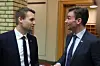 KrF fikk i sluttspurten de tre regjeringspartiene med på at regjeringen skal utrede et NRK-kor. Her KrFs forhandlingsleder Kjell Ingolf Ropstad i samtale med Høyres Henrik Asheim. Foto: Ørn Borgen / NTB scanpix