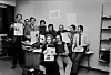 Journalist, styreformann og fungerende redaktør Arne Melland t.v. sammen med medarbeidere fra ulike avdelinger. Elisabeth Sørlie (foran) var eneste kvinnelige journalist. Foto: Foto: Sverre A. Børretzen / Aktuell / Scanpix