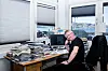 Morten Hofstad har stabler med aviser på pulten som har utsikt til fjorden i Sandnessjøen. Foto: Eskil Wie Furunes