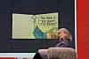 Ann Telnaes på scenen under Nordiske Mediedager i Bergen. I bakgrunnen tegningen som fikk henne til å slutte i Washington Post.Foto: Roger Aarli-Grøndalen