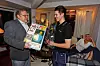 Tjue år etter han havnet på førstesiden i VG, fikk Robert Midtrud overrakt historien om egen fødsel i glass og ramme. Gutten som ble født i do vart da blitt rørlegger, til Janiks store forlystelse.Foto: Trond Solberg / VG
