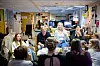 De samles litt etter litt, spiser rundstykker og venter på at resten dukker opp. Mange kommer for sent. De får et kryss i boken. Etter tre kryss er de nødt til å spandere en flaske vin eller kake på resten av gjengen.