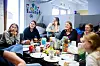 Kl 12.24: Før arbeidsdagen går redaksjonen gjennom en økt med mat, prat og quiz. De fleste duskerne som møter denne dagen er kvinner. Her følger Vilde Aurora Halle Tvedten (fra venstre), Ingvild Lyngnes, Marthe Bjerva, Tanja-Iren Harsvik Haugen og Sigrid Solheim med på det redaktøren sier.