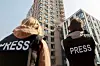 Journalister på jobb i Kyiv. Bildet er fra 23. mars i år.