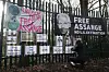 En av Julian Assanges støttespillere henger opp protestplakater mot at WikiLeaks-grunnleggeren utleveres til USA.