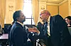 Filmskaper Ulrik Imtiaz Rolfsen i samtale med generalsekretær Arne Jensen i Norsk Redaktørforening før kjennelsen i Høyesterett ble opplest. Foto: Glenn Slydal Johansen
