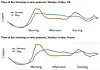 Mange trodde at de daglige nyhetspodkastene ville tape terreng fordi man ikke lenger reiser til og fra jobb, og jobbreisen har vært en viktig lyttersituasjon. Men lytterne har imidlertid funnet nye tider på døgnet - spesielt ettermiddagen byr på podkastlytting for britene og franskmennene.