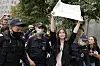 En russisk journalist blir pågrepet av politiet under en demonstrasjon i Moskva lørdag. Minst åtte journalister ble pågrepet. På plakaten står det «Vi kommer ikke til å slutte å være journalister».