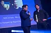 Joachim Førsund og Sigurd Øygarden Flæten tar imot prisen for Årets dokumentar-podkast. I år er Førsund nominert til Årets podkastprogramleder.
