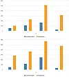 Sammenligning sommerkropp (blå) og kroppspress (gul) i norske medier fra 2013til 2016. Øverst: Papir. Nederst: Nett.
