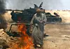 En stridsvogn brenner etter å ha blitt truffet av NATO-bomber. Foto: Reuters / NTB scanpix
