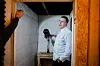 Peter Daatland viser frem det hjemmebygde studioet han har på kontoret sitt i Filt Oslo, som er en del av et større kontorfellesskap. Martin Holvik lyssetter. Foto: Eskil Wie Furunes