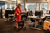 Carlsen har parkert gåstolen ved siden av pulten hun disponerer. Hun tar fram en rosemalt stokk og leder vei videre inn i et semirolig hjørne i det ellers så travle redaksjonslokalet.
