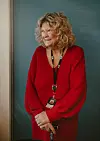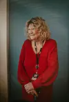 Marianne Rustad Carlsen er ikledd en knallrød kjole, og lyse krøller der hun nå dytter gåstolen foran seg inn og opp i etasjene på Marienlyst i Oslo.