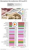 I den interaktive grafikken under kan du se gjennomsnittlig bransjelønn for NJ-organiserte i 152 norske mediebedrifter ved utgangen av 2014, sammenliknet med tallene for 2013. Bransjelønn brukes for å sammenligne statistikk for ulike sektorer i arbeidslivet og omfatter fastlønn og variable tillegg. Overtid og eventuelle bonuser ikke er medregnet.