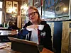 Asbjørn Svarstad sitter og jobber på kneipa Zwiebelfish i Berlin. Foto: Maria Rismo